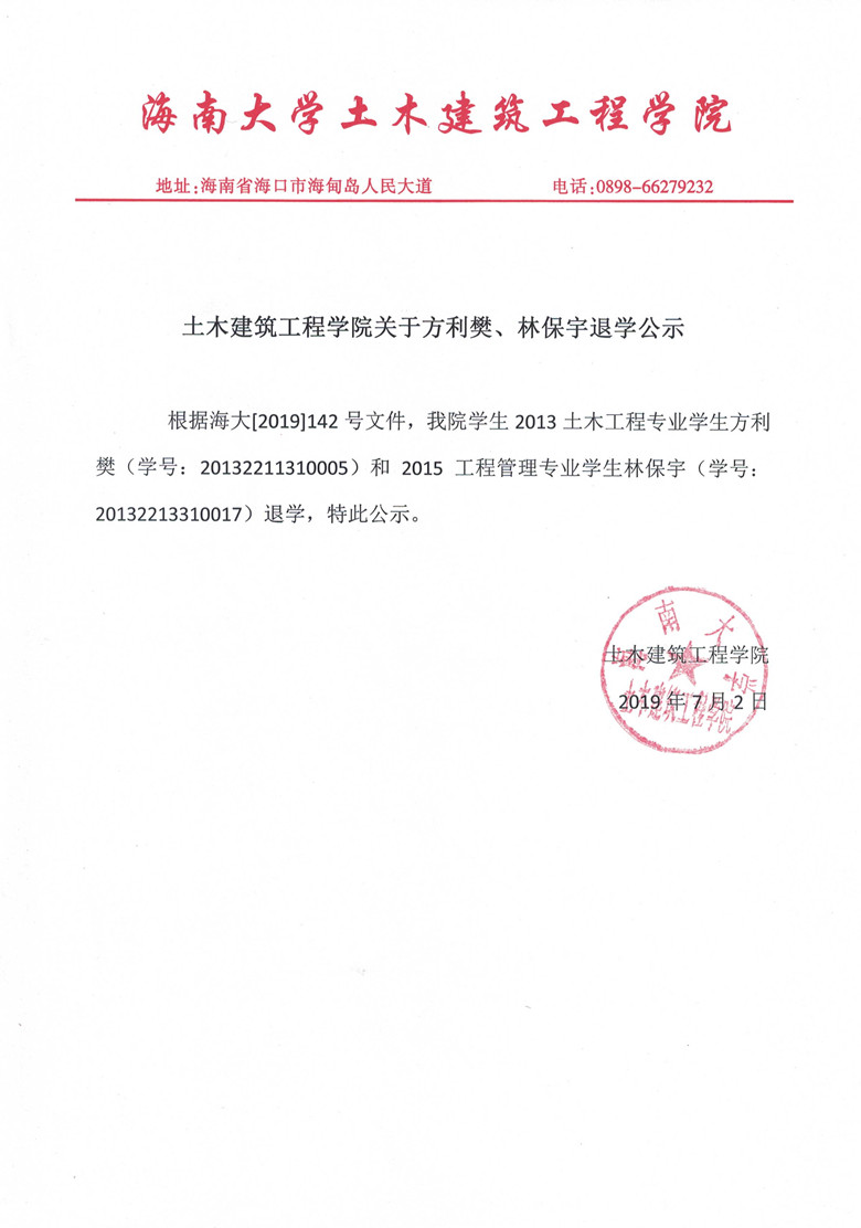 红足1世官网关于方利樊、林保宇退学的公示