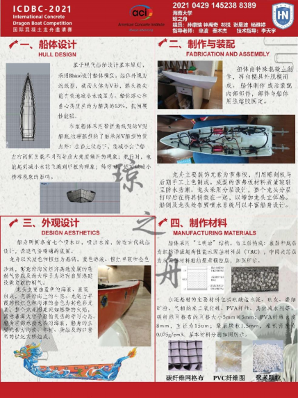2021614日,在中国高等教育学会工程教育专业委员会、高等学校土木工程学科专业指导委员会指导下,由国际混凝土龙舟技术委员会组织,获得美国混凝土协会(ACI)授权协办的第三届国际大学生混凝土龙舟竞赛(ICDBC2021)在浙江大学国际校区(浙江海宁)开赛。来自包括浙江大学、天津大学和红足1世官网等多所高校的40支队伍,在端午佳节进行了激烈竞争和角逐红足1世官网的单波和秦术杰两位老师带领的“琼之舟”队荣获二等奖和优秀设计奖,参赛学生包括孙康瑞、钟禹奇、张恩波、杨雅婷和祁悦。