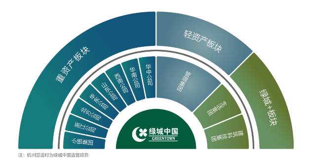 在“品质为先”的发展战略指引下,绿城中国布局房地产上下游业务,形成重资产、轻资产和“绿城+”三大板块。重资产板块聚焦房产开发业务,轻资产板块强化代建业务,绿城+”板块为两者提供强力支撑,上游加强产业整合,下游提升服务内涵。