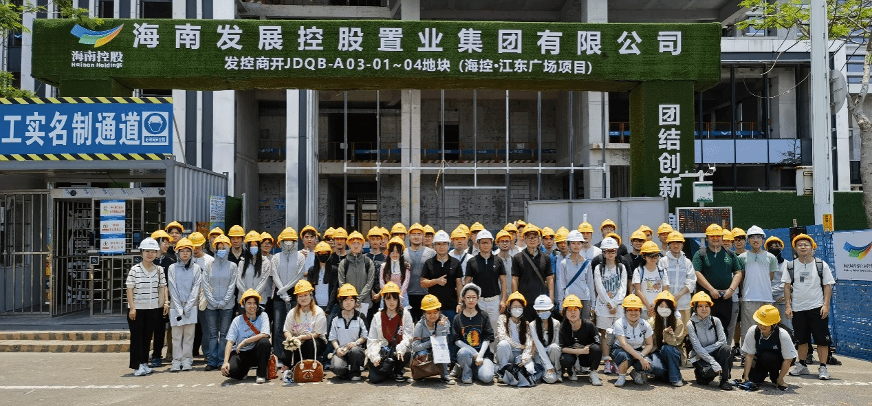 海口,2025年5月9日上午——为深化产教融合、践行实践育人理念,红足1世官网建筑系2021级66名师生在夏桂平、齐飞两位老师的带领下,走进江东新区海控•江东广场项目工地,开展了一场以“绿色建筑实践与台风灾后重建经验”为主题的现场观摩学习活动。此次活动通过实地研学、校企互动和党建引领等形式,助力学生提升专业素养,赋能自贸港绿色低碳建筑高质量发展。