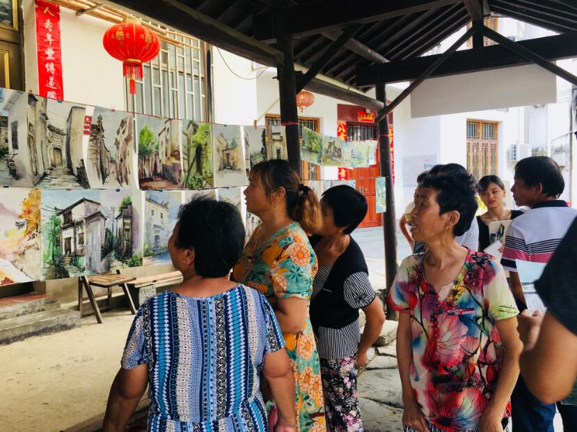 建筑学带队老师和学生们展出了自己在上晓起村写生的水彩作品,展览期间,村民和游客纷纷驻足欣赏,对此次画展赞不绝口。有的村民说:“这幅画画的是我家大门,画的真像。”有的村民说:“住在村子里几十年了,看到周围都麻木了,看了你们的画,才发现我们的村子那么漂亮,以后每看到一个地方,都会想到你们的画。”村民们虽语言朴实,但道出了他们的欣喜。