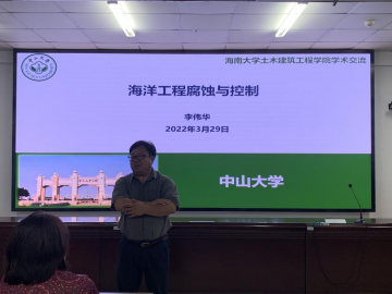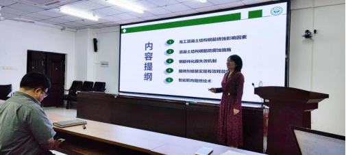 李伟华教授的报告聚焦海洋工程腐蚀与控制,首先介绍了海洋环境腐蚀的严酷性,针对海工混凝土中钢筋锈蚀问题,深入阐明了钢筋钝化膜失效机理、防护技术、研究对策,着重讲解了团队在靶向阻锈剂研究方面的工作和成果,以及成果转化进展。报告结束后,李教授就师生感兴趣的问题进行了答疑。