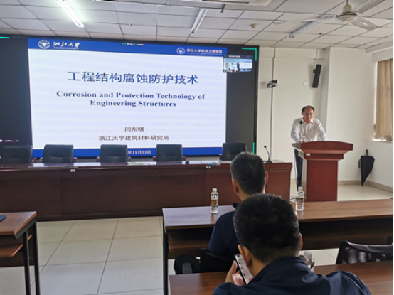 闫东明教授的报告聚焦工程结构腐蚀防护技术,他首先介绍了金属腐蚀原理、基础及工程结构耐久性重要性,然后分别就混凝土结构和钢结构的腐蚀与防护技术进行了深入细致地报告,最后着重讲解了团队在探索工程结构防腐蚀新材料研究方面所取得的科研成果及业绩,以及工程应用情况,报告结束后,闫东明教授就师生感兴趣的问题进行了解答。