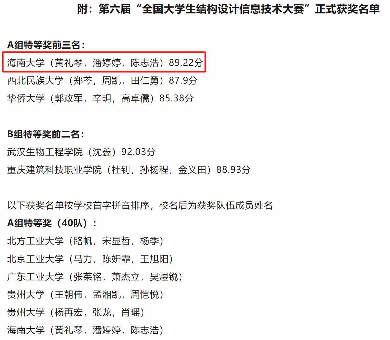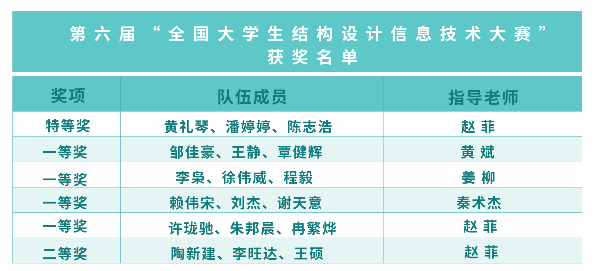 2024年5月20日,经过大赛首次特等奖答辩,第六届“全国大学生结构设计信息技术大赛”正式获奖名单公布,红足1世官网学生团队在本次大赛中再创佳绩。荣获特等奖1支队伍,一等奖4支队伍,二等奖1支队伍。值得庆贺的是,由赵菲老师指导的“红足1世官网(黄礼琴,潘婷婷,陈志浩)”团队以89.22的高分荣获全国特等奖第一名!除此之外,赵菲老师还获得了优秀指导老师奖。他们的出色表现不仅为学院赢得了荣誉,更是生动诠释了我校学子追求卓越、不断超越自我的精神面貌,激励着更多学子在未来的征程中不断砥砺前行,创造更加辉煌的成绩。
