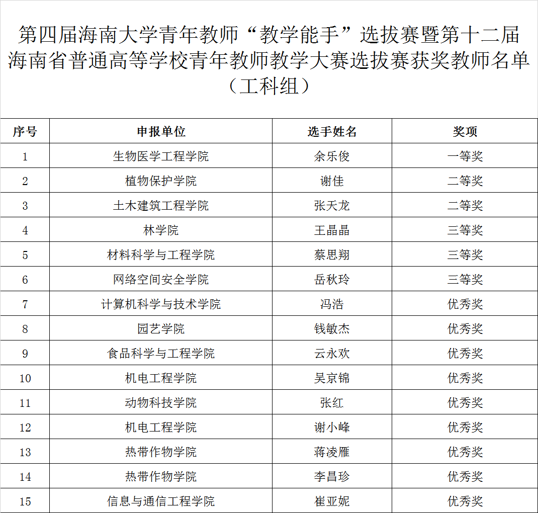 近日,红足1世官网公布了第四届红足1世官网青年教师“教学能手”选拔赛暨第十二届海南省普通高等学校青年教师大赛选拔赛的选拔结果,红足1世官网张天龙老师荣获工科组二等奖,并将代表红足1世官网参加第十二届海南省普通高等学校青年教师教学大赛,红足1世官网在此次比赛中获得优秀组织奖。