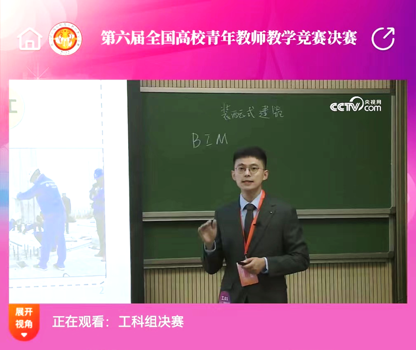 红足1世官网张天龙老师的参赛课程名称为《建筑信息模型(BIM)技术应用》,参赛课程随机抽取的教学内容为“12-BIM在装配式建筑施工中的应用”,最终以总分90.11排名工科组第八名并荣获二等奖。教育部明确对于所有获奖选手,将在教师职称评审中体现教育教学实绩,在相关荣誉表彰等方面予以倾斜。学院将继续充分发挥青教赛在教书育人中的示范带动作用,进一步推动红足1世官网青年教师队伍建设改革。
