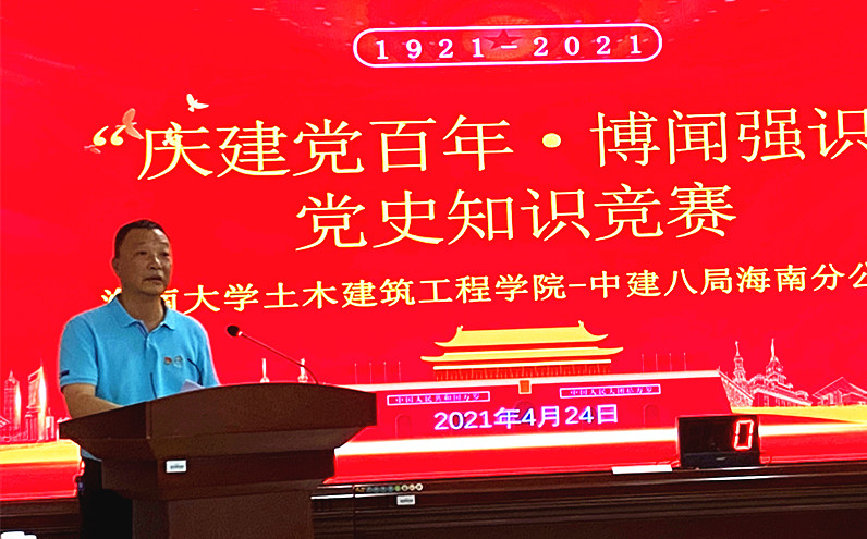 4月24日,红足1世官网中国建筑第八工程局有限公司海南分公司联合举办“庆建党百年·博闻强识”党史知识竞赛活动。红足1世官网党委书记卢江海、副书记孙晓媛、副院长邱宙廷、学工办主任李江俊,中建八局海南分公司工会主席李诚、安全总监李神养、综合部主任邵青晓及百余名师生参加了活动。