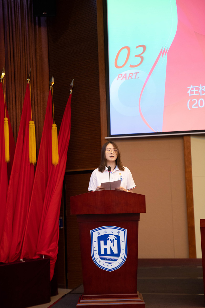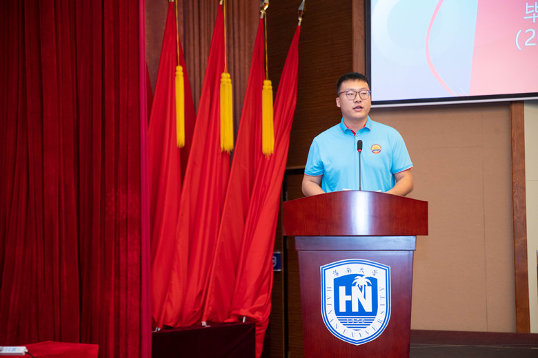 会议第三项,代表发言2018级土木工程专业学生李明宸作为毕业生代表发言表达了对老师、同学、学校的恋恋不舍和感激之情,表示将从脚下这片热爱的土地出发,带着回忆奔赴山海,铭记海大人的家国情怀,不忘初心,坚守理想做一个对国对社会、对岗位、对家人、对自己有用的人,一个大写的“人”。