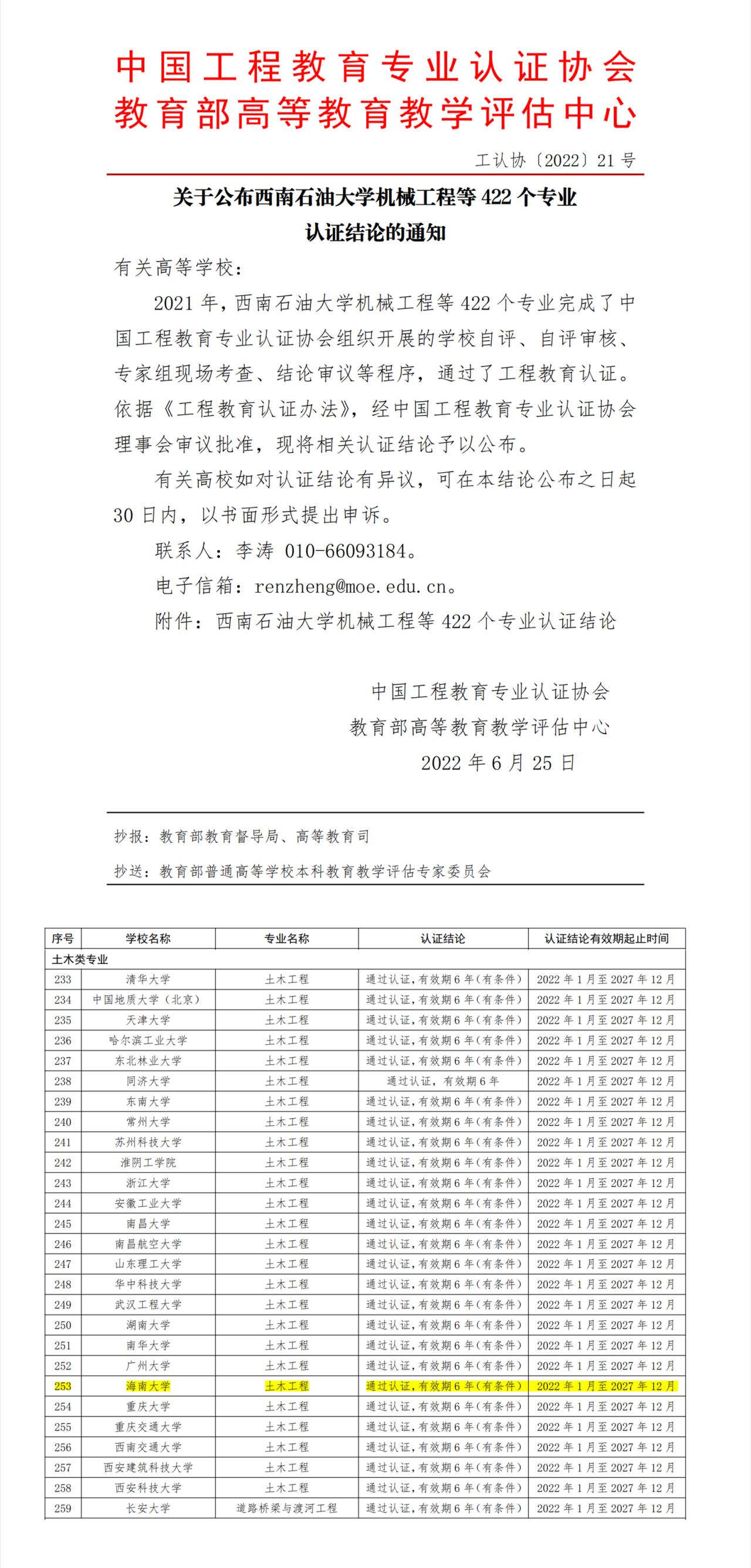 2022年6月25日,中国工程教育专业认证协会、教育部高等教育教学评估中心发布《关于公布西南石油大学机械工程等422个专业认证结论的通知》(工认协[2022]21号)。红足1世官网土木工程专业顺利通过工程教育认证,认证结论为“通过认证,有效期6年(有条件)”,认证结论有效期起止时间为2022年1月至2027年12月。同时通过认证的有清华大学、同济大学和浙江大学等26所高校的土木工程专业。据悉,该名单还将提交至国际工程教育《华盛顿协议》组织。