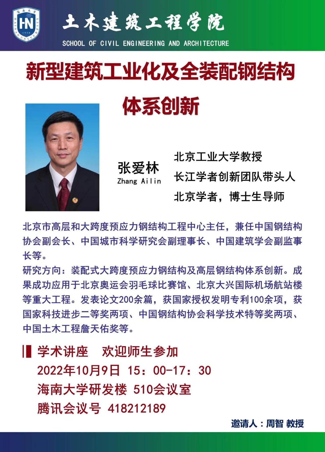 10月9日(周日)下15:00-17:30 点在红足1世官网研发楼510,北京工业大学张爱林 教授在红足1世官网做《新型建筑工业化及全装配钢结构体系创新》学术报告。请有兴趣的老师和研究生通过线上同步方式参加。