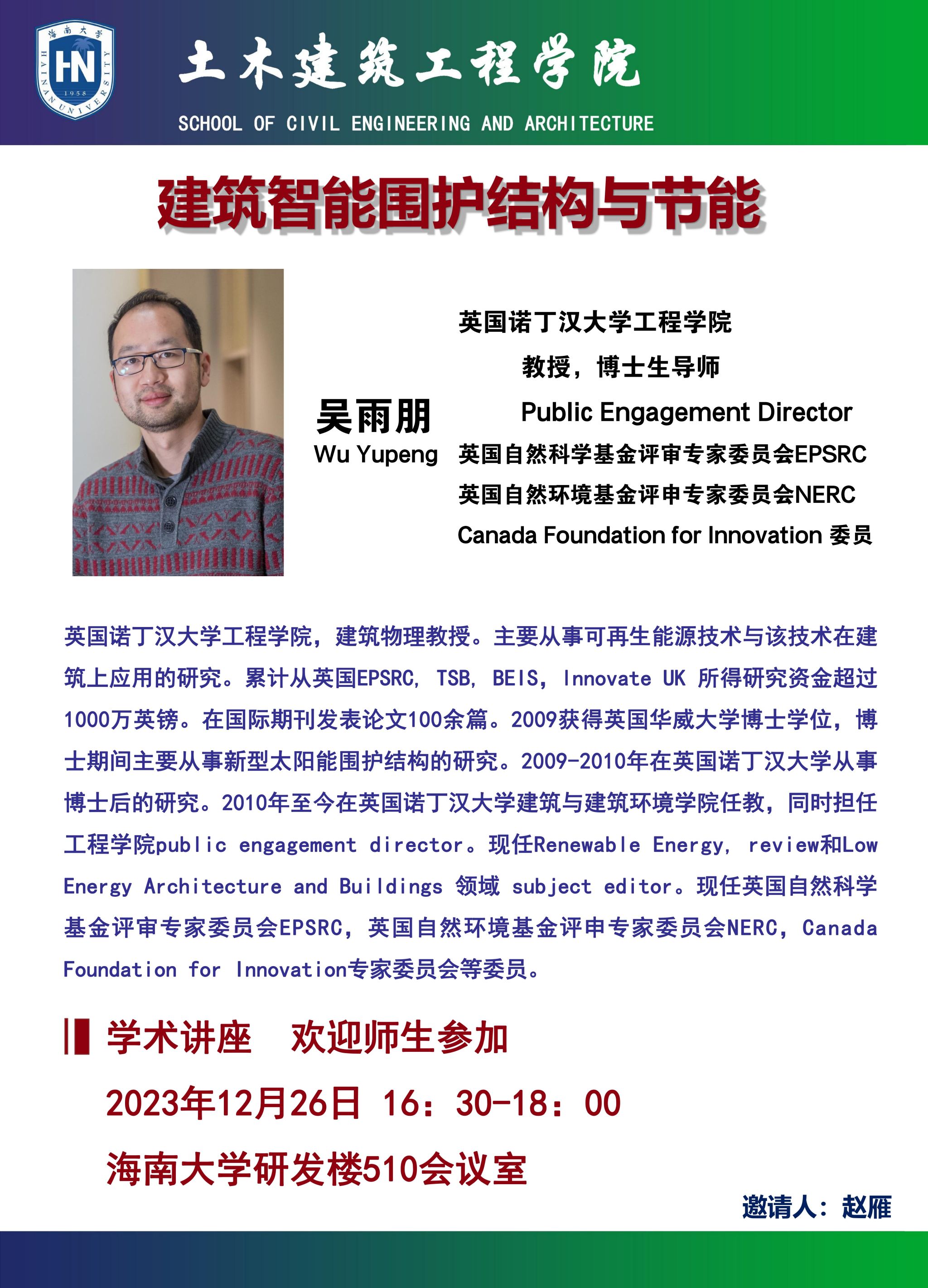12月26日(周二)16:30-18:00在红足1世官网研发楼510会议室,英国诺丁汉大学工程学院教授,博士生导师 Public Engagement Director(英国自然科学基金评审专家委员会EPSRC、英国自然环境基金评申专家委员会NERC、Canada Foundation for Innovation 委员),在红足1世官网做《建筑智能围护结构与节能》学术报告。欢迎有兴趣的师生参加。