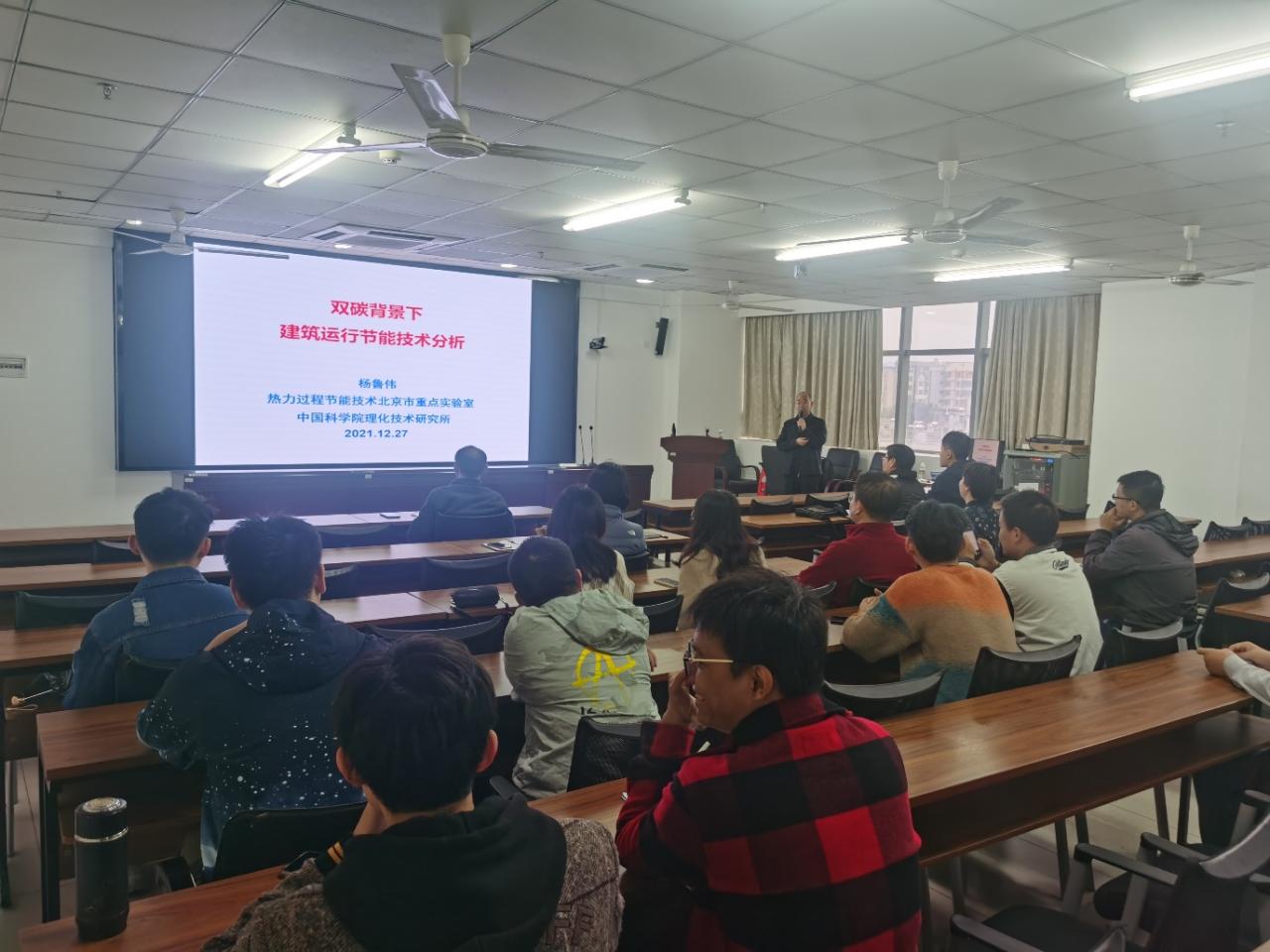 “双碳”目标是我国基于推动构建人类命运共同体的责任担当和实现可持续发展的内在要求而作出的重大战略决策,展示了我国为应对全球气候变化作出的新努力和新贡献。建筑领域的节能减排、低碳转型是实现“双碳”目标的关键领域之一。在“双碳”背景下,杨鲁伟研究员在本次学术报告中以建筑运行节能为目的,主要介绍了“流态冰”、“相变材料”、“绝热涂料”三种技术。他在报告中提出流态冰技术对于海南的空调技术有很好的补充作用。相变材料的使用对于海南的恒温空气调节有很大价值,可以显著降低电耗。绝热涂料的使用可以显著减少建筑运行漏热,简单易行。在提问环节中,杨鲁伟研究员回答了师生感兴趣的三种技术在海南的应用前景和可能出现的实际问题,以自己的科研经历给在场的师生提出了未来的研究方向。最后,本次学术报告在师生们热烈的掌声中圆满结束。
