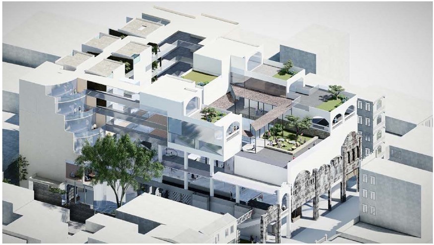 设计外观融入了当地骑楼建筑的相关元素,抽取骑楼的内核精神,从功能的角度出发,分析骑楼建筑形式诞生的原因,将复古风格演绎出现代变体,实现传统建筑的现代化的再演。设置丰富的共享空间,利用传统骑楼廊道使使用者之间增加交流,更好的体会当地历史文化。
