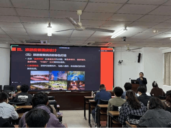 随后讲座正式开始,张新平总建筑师分别介绍了酒店的基本概念、酒店的功能构成、功能流线和旅游度假酒店设计,层层深入地讲述了旅游度假酒店的设计方法和建筑师可以借鉴的一些设计思路。例如针对酒店功能流线设计,他指出后勤系统的流线设计是方案设计时需要重点考虑的,要充分考虑空间布局、通道通畅性等因素;而公共区域的流线设计要结合酒店的实际情况,如餐厅、厨房等。关于旅游度假酒店的功能构成和设计理念,他强调度假酒店需要有特色,包括依托文化、人文主题、自然资源等,以及酒店的娱乐活动、建筑风格、环境特色、服务特色等。通过这些方面的结合,可以打造出具有特色的度假酒店。